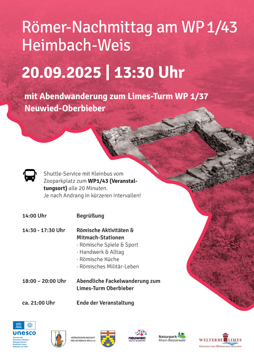 Terminhinweis: 20. September 2025 -Römerfest in Heimbach-WeisFür Sonntag, den 20. September 2025, ist im Rahmen des Jubiläumsjahres "20 Jahre Welterbe Obergermanischer Limes" ein Römerfest an der Limes-Turmstelle WP 1/43 in Heimbach-Weis (Neuwied) geplant. Um 14:00 beginnt dort der Römer-Nachmittag. Von 14:30 bis 17:30 Uhr sind verschiedene römische Aktivitäten geplant. Um 18:00 Uhr startet dann die abschließende Fackelwanderung zum Limesturm in Neuwied Oberbieber.