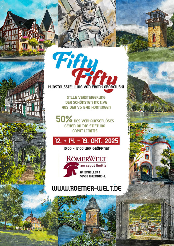 Terminhinweis: 12.-19. Oktober 2025 - FiftyFifty-Kunstaktion mit stiller Versteigerung in der RömerWelt am caput limitis RheinbrohlWährend des nächsten Thementages "Großer Backhaustag und Bronzeguss" am 12. Oktober 2025 startet eine ganz besondere Kunsta(u)ktion in der RömerWelt am caput limitis in Rheinbrohl. Die dann bis zum darauffolgenden Sonntag im Vortragsraum der RömerWelt "Aula Nova" ausgestellten Werke des in Rheinbrohl geborenen Künstlers Frank Grabowski sollen nämlich nicht nur gezeigt, sondern auch "still" versteigert werden: