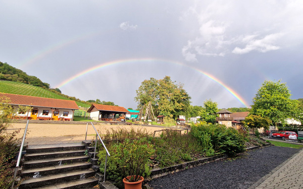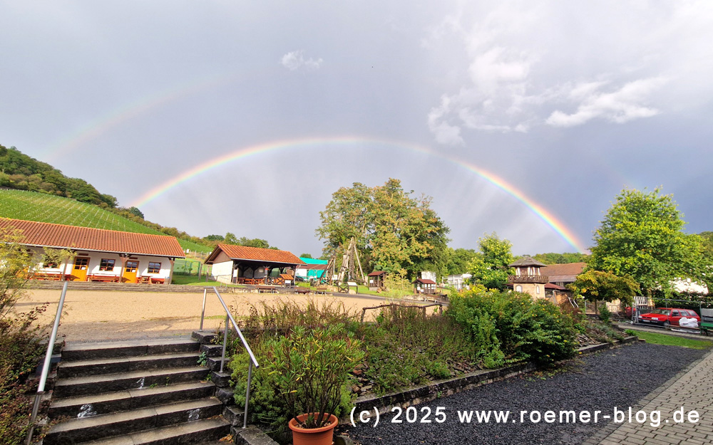 Regenbogen über in der RömerWelt am caput limitis RheinbrohlDas aprilige Fast-Herbst-Wetter hat auch seine schönen Seiten: So zeigten sich heute eineinhalb Regenbögen über der RömerWelt am caput limitis. Meiner jüngsten Erfahrung nach wartet aber am Ende des Regenbogen kein Topf mit Gold, sondern ein Staubeginn.