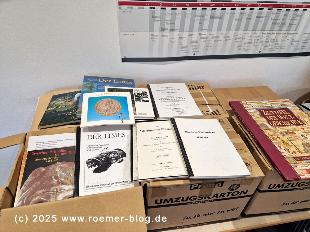 Die Bücher, die thematisch in die Bibliothek der RömerWelt passen, werden dann nach Inventarisierung während der Öffnungszeiten der RömerWelt zu Einsicht bereitliegen. Während der Winterpause ist das auf Anfrage während der Bürozeiten möglich.