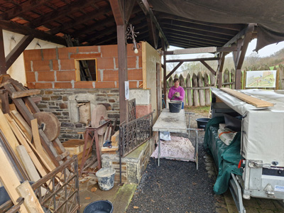Eigentlich wollten wir sowohl die beiden Lehmöfen noch umsetzen, damit Besucher bessere Sicht bei den Vorführungen haben. Aber aus mehreren praktischen Gründen haben wir nur doch den Kühlofen um ein paar Grad gedreht. Was für ein Glück, dass beide Öfen auf Stahlpaletten gebaut wurden.