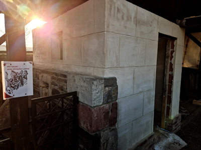Vom ehrenamtlichen Bau der Latrine hatte ich ja hier im RömerBlog bereits mehrfach berichtet. Hier fehlt allerdings noch die Berichterstattung von dem drei samstäglichen Verputz-Aktionen. Dafür ist jetzt meine Zeit zu knapp, aber ich verspreche, dass ich das demnächst nachholen werde. Bei passender Gelegenheit werden die Wände noch mit Kalkfarbe gestrichen und außen mit rotem Fugenstrich versehen. Dann fehlt nur noch das Dach.