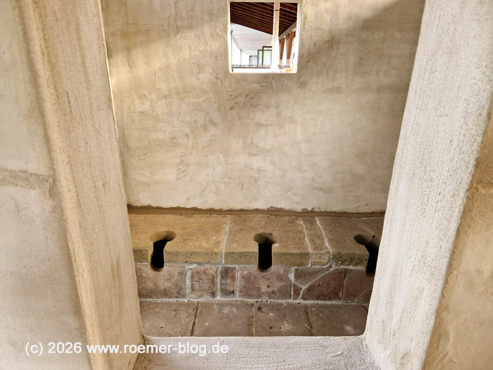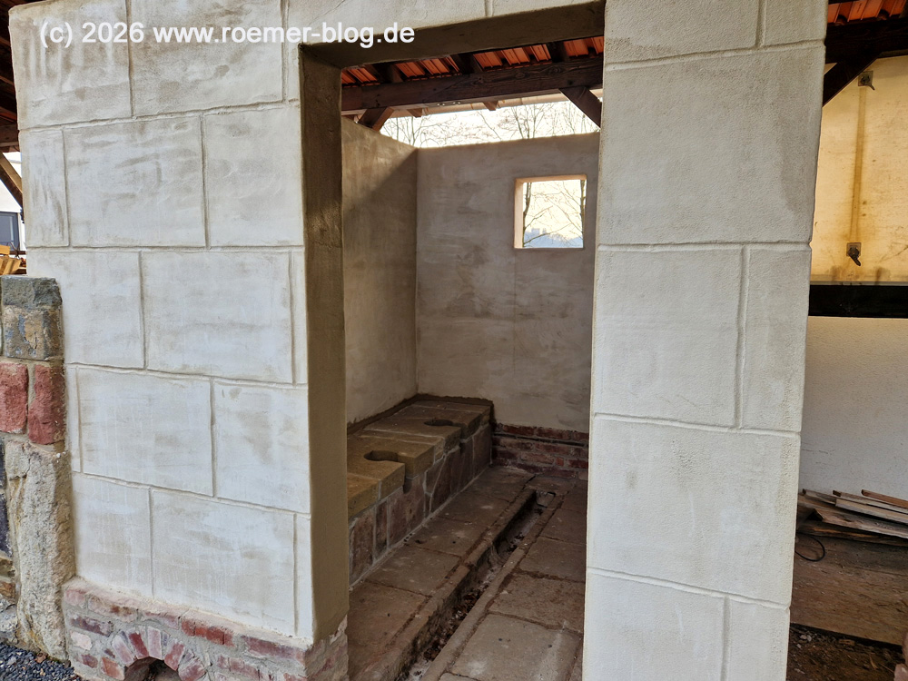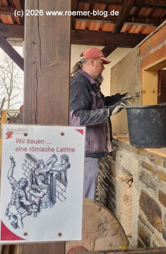Bau einer Latrine in der RömerWelt - Teil 7: PutzarbeitenSchon seit längerem ist die Rekonstruktion einer römischen Toilettenanlage, in Fachkreisen Latrine genannt, in der RömerWelt am caput limitis in Rheinbrohl in Arbeit. Nach dem Mauern der Wände im Oktober letzten Jahres (siehe RömerBlog-Beitrag vom 6.10.2025) mussten wir erst die Winterpause abwarten, bis wir mit dem Verputzen anfangen konnten. Und dieser Winter dauerte länger als gedacht. Und der Termin der Saisoneröffnung am 15. März rückte unerbittlich näher ...