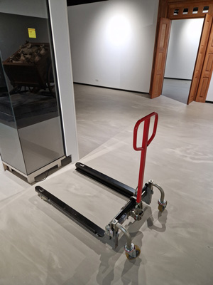 Der Preis war zwar recht üppig, aber das Ding hat sich wirklich gelohnt! Schließlich wollen mehr als ein Dutzend Vitrinen ihren Platz in der neuen Ausstellung finden. Dafür müssen sie noch eiige Male bewegt werden, was mit diesem Flurförderzeig auch alleine prima möglich ist. Sogar beider Wiederherstellung desbisherigen Ausstellungsbereiches nach Abbau der Staubschutzwand hat er schon prima geholfen. Es geht nichts über ordentliche Flurförderzeuge!