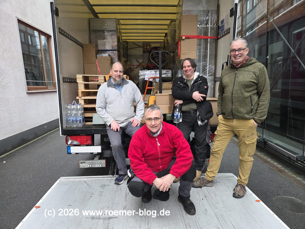 Wir hatten mit dem "Lagerraum-Poker" extrem viel Glück, denn genau dann, als der Lagerraum "bezugsfertig" gemeldet wurde, war der allerallerletzte Zeitpunkt erreicht, zu dem die letzten verfügbaren Vitrinen das LVR-Landesmuseum Bonn verlassen mussten. Als Deadline stand der 30. Januar im Raum, also wurde der 29. Januar als Abholtag vereinbart. Dann startete das Bangen: Klappt alles mit dem Miet-LKW? Räumt uns das Winterwetter trockene Ladezeiten ein? Wie sind die Straßenverhältnisse? Natürlich lag im Westerwald noch Schnee, also genau dort, wo noch ein kurzer Hubwagen, kistenweise Spanngurte und massenweise Polstermaterial und große Pappen zum Zwischenlegen geholt werden mussten. Und klappen auch die Anreise von Dirk und Murph aus Köln und Niederkassel sowie von Corrado, der ja mit Minden eine nicht nur bei winterlichen Verhältnissen durchaus respektable Distanz bis nach Bonn zurückzulegen hatte.